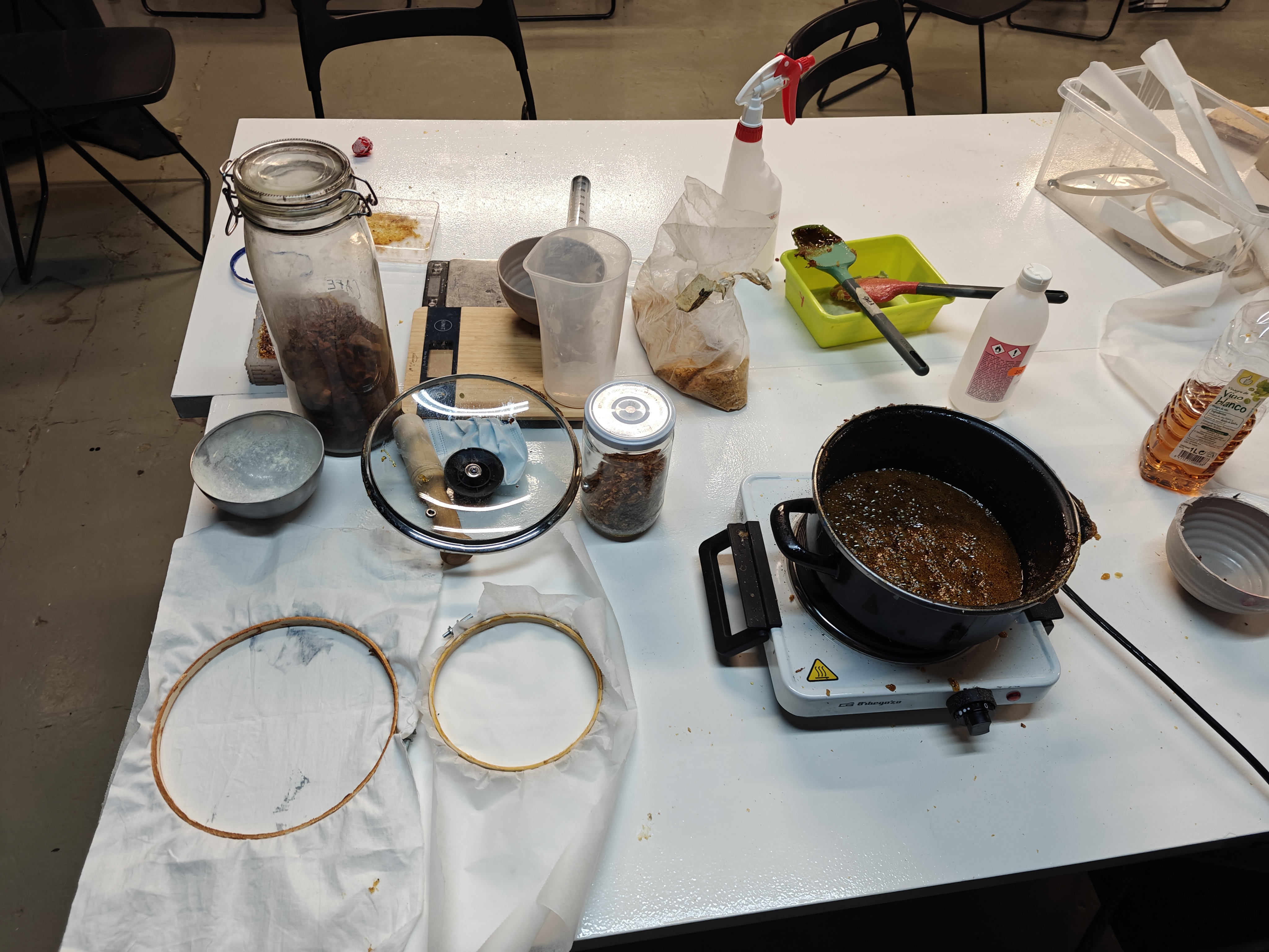 Exploring Biomaterials was a great hands-on experience. It felt like a cooking class. I loved the variety of materials, their qualities, and the results. I tried getting some amount of transparency. The pine resin was fragile so I realised I had to add fillers, or more wax, which would kill the transparency either way. I decided to add fillers but in a limited quantity. I also chose the filler with larger size so that there would be gaps to bring my transluscent effect to the material. The recipe and process are provided alongside.